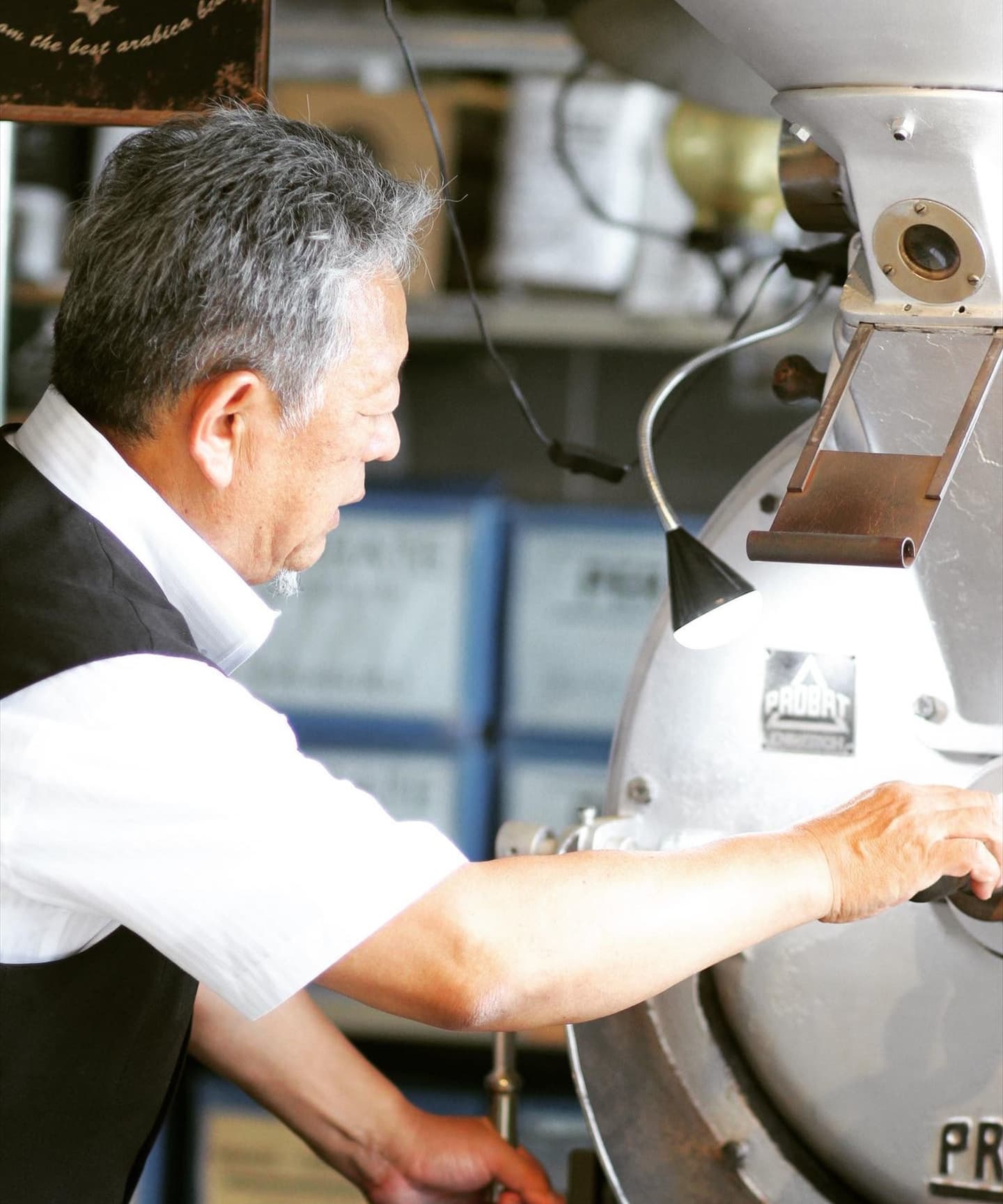 現在の店主、2代目・一美 洋二郎。店を継ぐこととなったのはまだ20代の青年の頃。先代から受け継いだ歴史とまる味屋の味を守りつつも、昭和・平成・令和と大きく変化してゆく3つの時代のエッセンスを常に先取りしてきた。座右の銘は、日々是焙煎。世界中の産地で大事に育てられた珈琲の持ち味を如何に引き出すか?丹念な焙煎の原動力は、生産者への揺るぎない敬意である。無名の農園でもその目利きにかなう生豆は積極的に取り扱い、確かな焙煎の腕で人気銘柄へと育て上げてきた。