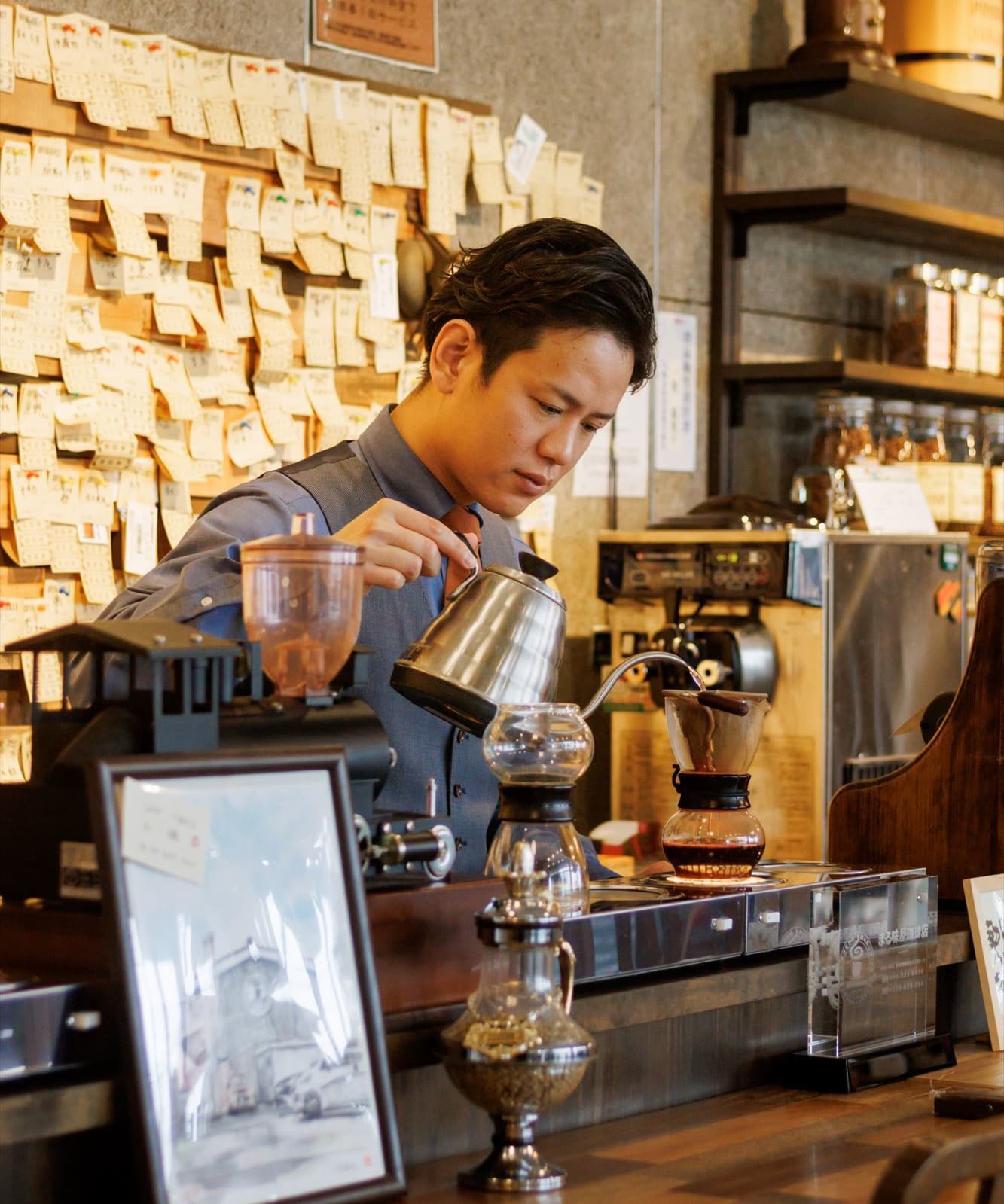 現在の店主、2代目・一美 洋二郎。店を継ぐこととなったのはまだ20代の青年の頃。先代から受け継いだ歴史とまる味屋の味を守りつつも、昭和・平成・令和と大きく変化してゆく3つの時代のエッセンスを常に先取りしてきた。座右の銘は、日々是焙煎。世界中の産地で大事に育てられた珈琲の持ち味を如何に引き出すか?丹念な焙煎の原動力は、生産者への揺るぎない敬意である。無名の農園でもその目利きにかなう生豆は積極的に取り扱い、確かな焙煎の腕で人気銘柄へと育て上げてきた。